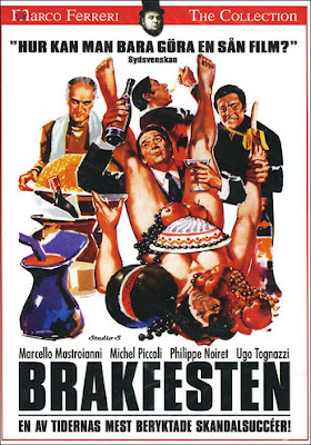 La grand bouffe (1973) är väl lätt ökänd för att vara bland det mer grisiga (hedonistiska) som fångats på film. Intrigen är rätt ”kul”: Fyra män samlas över en helg i en villa med målet att äta sig till döds. Lägg där till att dom bjuder in ett gäng prostituerade och… svineriet når en hög nivå! Å ena sidan kan man se det som en oerhört infantil film vars poäng mest är exploaterandet av kvinnor ackompanjerat av en massa kropps- vätskor och gaser. Men… och här skulle det vara snyggt att säga något om att det finns en djupare mening, att filmen är en allegori som sätter fingret på något viktigt. Fast jag tror inte att så är fallet. Jag ser faktiskt ingen poäng med La grand bouffe utöver att den är rolig och kanske inte tänkvärd utan mer… knäpp. På ett roligt och gränsöverskridande vis. Det gäller att inte ta den på för stort allvar för då kanske man råkar bli upprörd utan bara ta den för vad det är: Ett galet experiment!